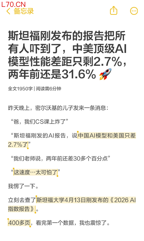 斯坦福刚发布的报告把所有人吓到了,中美顶级AI模型性能差距只剩2.7%,两年前还是31.6%