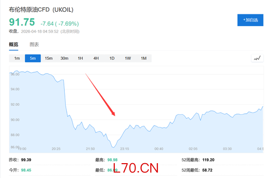 伦敦证券交易所集团(LSEG)数据显示,4月17日格林威治时间12时24分至12时25分,投资者在短短1分钟内合计卖出7990手布伦特原油期货,按当时价格折算约为7.6亿美元。