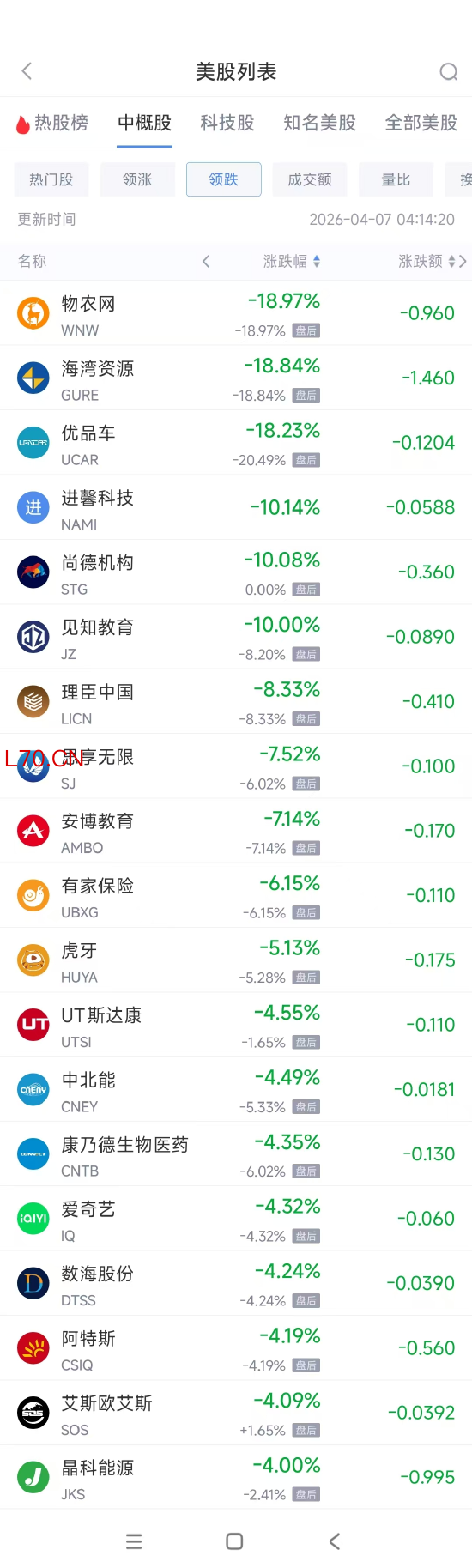 领跌中概股列表: