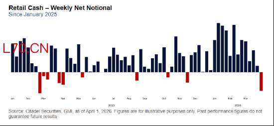 尽管散户上个月仍是净买家,但参与度大幅放缓。3月净名义支出较前一个月下降约55%,较1月峰值下滑约70%。