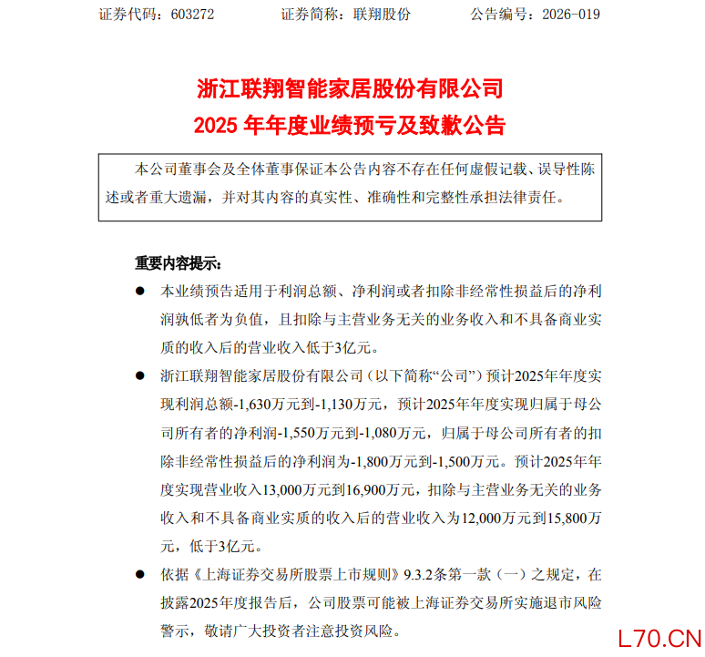 元股证券:ygzq.hk4月19日晚间,联翔股份(603272)披露延后的2025年业绩预告,并为期内业绩亏损及存被实施退市风险警示风险致歉。