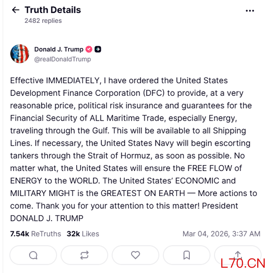 当天,特朗普在其社交媒体平台Truth Social上发帖称,已指示美国国际开发金融公司(DFC)以非常合理的价格提供政治风险保险和保证,以确保所有海上贸易的金融安全,特别是通过海湾的能源贸易。如有必要,美国海军将尽快开始护送油轮通过霍尔木兹海峡。