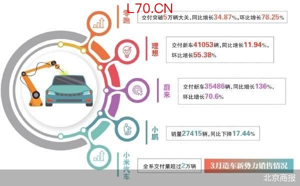 4月1日起,造车新势力陆续发布3月交付数据,头部车企重回3万辆月销大关,在传统淡季后行业整体实现销量回暖。其中,零跑继续领跑,交付量破5万辆,理想、蔚来月销量分别突破4万辆和3万辆,小鹏和小米则位居2万辆的销量区间,行业呈现分化态势。